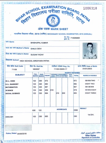 Sample educational certificate marksheet for OCR processing